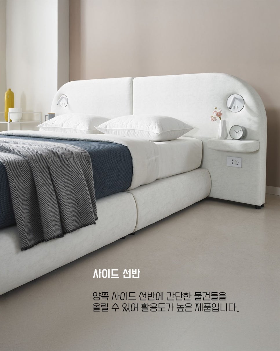 양쪽으로 마련된 넓은 선반은 잠들기 전 자주 사용하는 물건들을 올려두기에 충분합니다.